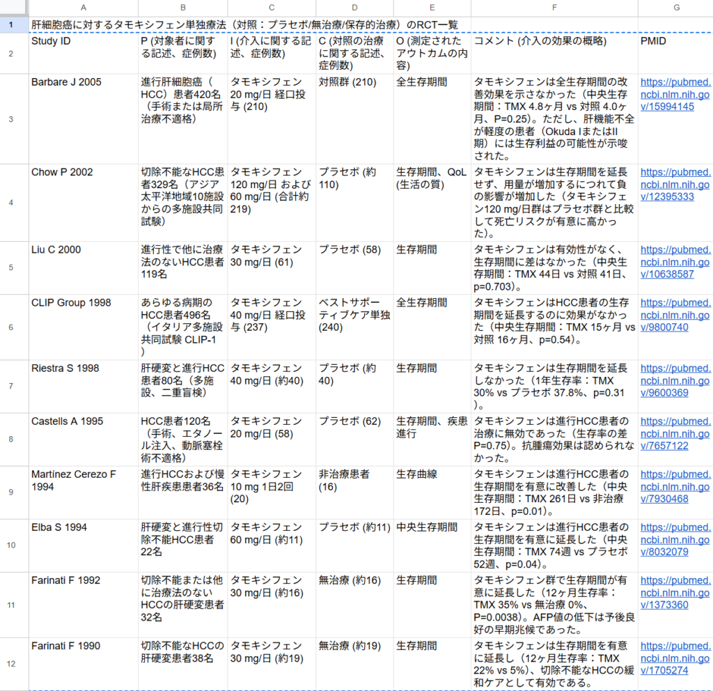 Cochrane systematic reviewのひとつである、Naing C 2024の論文を基準として、用い、CQは「手術不能の肝細胞癌患者にタモキシフェンによる薬物療法はプラセボまたは同等の治療と比べ生存を改善するか?」です。P:肝細胞癌患者、I:タモキシフェン投与、C: プラセボ・無治療・保存的治療のみ、O: 生存