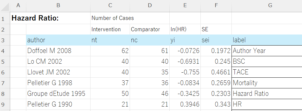 データはExcelで図のように準備します。介入群の症例数、対照群の症例数、ハザード比HRの自然対数、その標準誤差の値が必要になります。labelは研究名のラベル、対照、介入のラベル、アウトカム、効果指標のタイプ、その略称です。