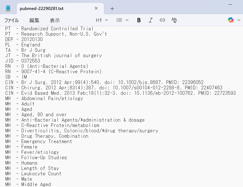 今回は、前回用意した大腸憩室炎に対するランダム化比較試験218件のアブストラクトの情報から臨床に必要な情報を引き出せるか試してみますが、Abstractを含むテキストファイルはかなりの大きさになるので、まずGeminiで扱える情報の大きさを調べてみましょう。