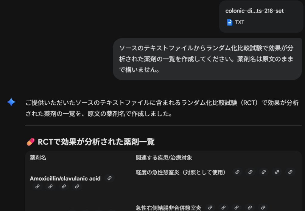 以下に述べるトライアルは2025年12月6日の時点での結果です。思考モード(3 Pro搭載)を使うこともできますが、高速モードを用いていますので先に述べたように、Gemini 2.5 Flashを使っています。まず、Geminiへのプロンプトを入力のフィールドにアブストラクトのテキストファイルをドラグアンドドロップします。ワード数が訳6.8万なので、問題なくアップロードできます。(ファイルが大きすぎる場合はアラートが出ます。)それに続けて、以下のプロンプトを書き込み、今までどのような抗生物質がテストされてきたかをまず調べます。