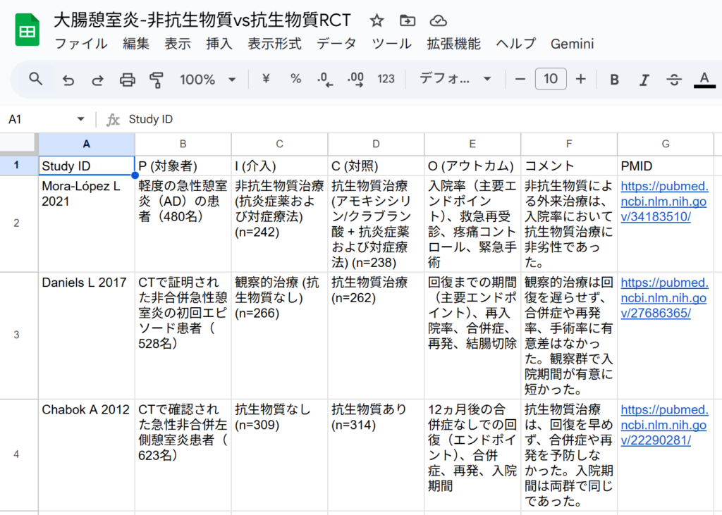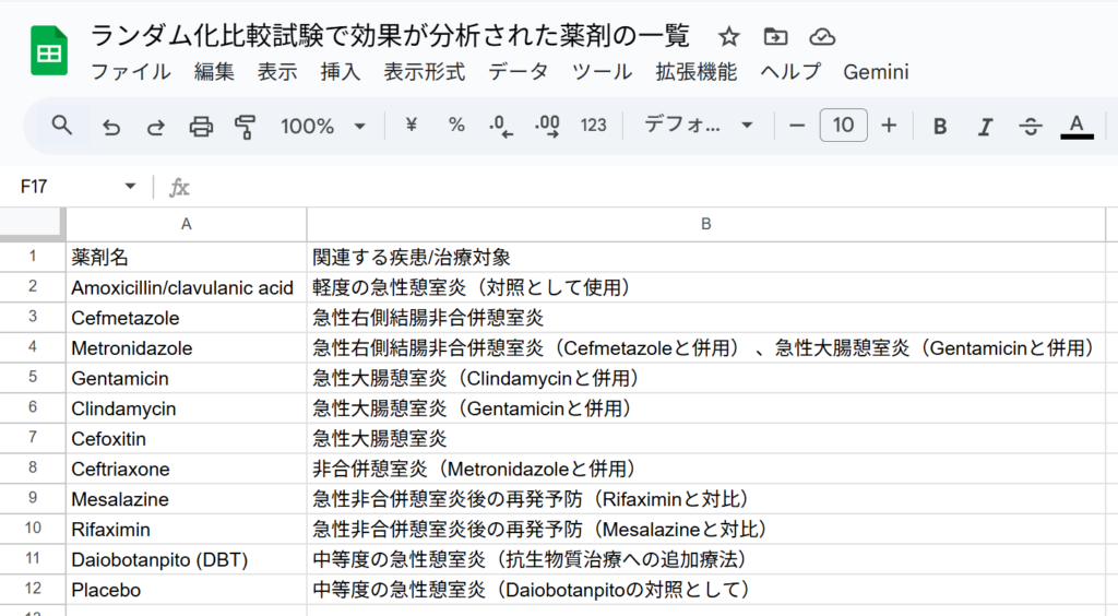 当然のことながら、Levofloxacinを治療薬として使用しているランダム化比較試験は見つからないと回答し、使用された抗生物質をリストアップして、「介入がLevofloxacin」という基準を除外し、「抗生物質群と無抗生物質(または非観察的/非手術的)群を比較した成人非合併大腸憩室炎を対象とするランダム化比較試験(RCT)」を抽出した参考情報として表が出力されました、と回答しています。表の部分ををCSVファイルとして保存し、さらにGoogleスプレッドシートにインポートして形式を整えた画面が以下の図です。