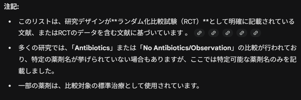 試しに、Levofloxacinの効果について聞いてみることにしました。PICO要約表を作成するように指示しており、採用基準と除外基準を設定して、ランダム化比較試験に限定するよう指示しています。このプロンプトは採用基準と除外基準を書き換えることで、プロトタイプとして、他のクエスチョンにも使えるはずです。