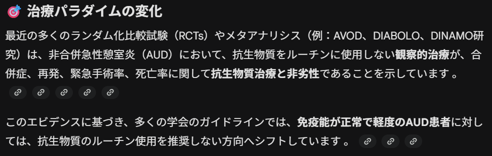 さらに、また、治療アルゴリズムや伝統的なパラダイムの変化を議論し、臨床的推奨に影響を与える以下の文献も含まれています、との記述が続き、文献が引用されていました。そして、これらの文書は、大腸憩室炎の診断、内科的・外科的治療、および再発予防に関する従来の慣行が変化していることを示しており 、特に非合併急性憩室炎に対する抗生物質の非ルーチン使用が最新の推奨事項であることを裏付けています、との記述がありました。