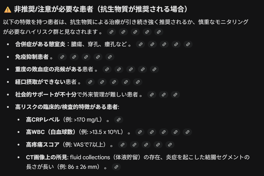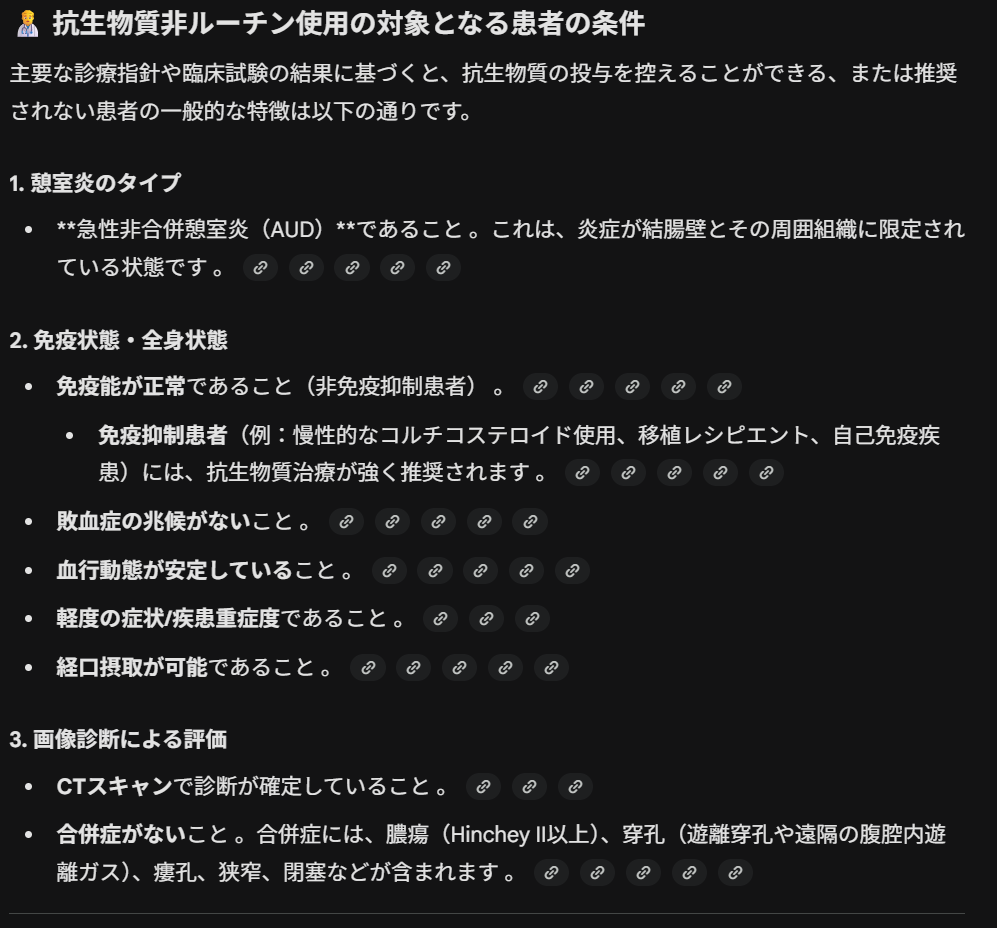 最後に、「抗生物質非ルーチン使用の対象となる大腸憩室炎患者の条件は?」に対するGeminiの回答の詳細を提示しておきます。