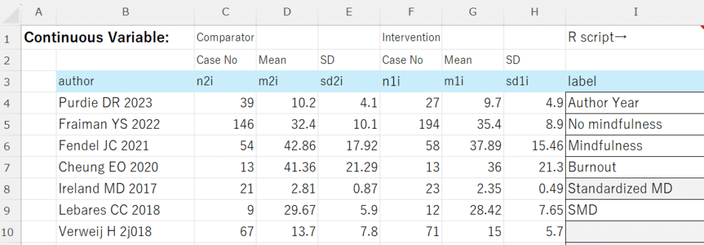 データはExcelで図のように準備します。labelは研究名のラベル、対照、介入のラベル、アウトカム、効果指標のタイプ、その略称です。セルI9がMDの場合は、平均値差、SMDの場合は標準化平均値差を計算します。この例ではSMDを計算します。