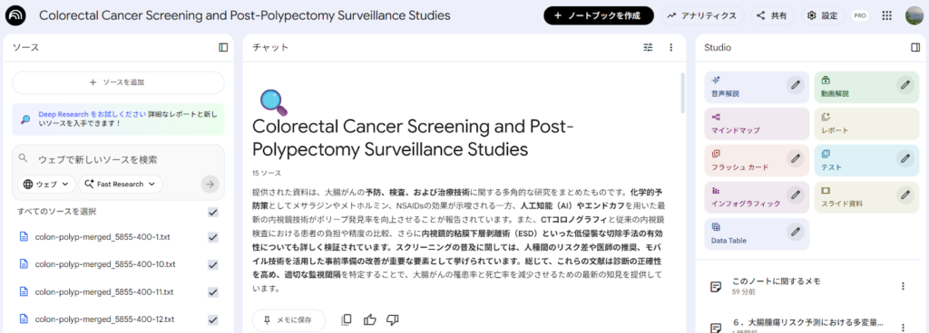 特定のテーマについて医学知識をアップデートしたい場合、さまざまな方法が考えられるが、PubMedから論文のアブストラクトの情報を収集し、それらをNLMのソースにアップロードして、プロンプトで必要な情報を引き出すことができるか試してみることにする。元の情報は英語であっても、プロンプトは日本語で書くことができ、回答も日本語で得られる点は利点の一つである。