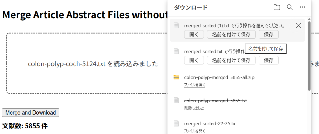 マージされた文献数が提示され、右上に名前を付けて保存のボタンが現れるので、クリックし、ファイル名を付けて保存する。このファイルには、2つのテキストファイルから重複を除いた文献が含まれている。