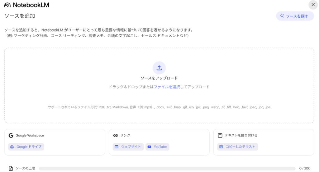 NLMのサイト(https://notebooklm.google.com/ )を開き、右上の+新規作成ボタンをクリックすると、最初にソースをアップロードするパネルが表示される。