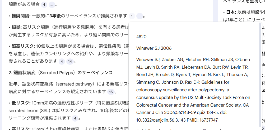 出力された回答には、参照したテキストの箇所を表示するための番号が振られた箇所があり、そこへマウスをホバリングするとその箇所がポップアップパネルに表示され、そこをクリックするとその箇所が左のパネルに表示される。下の図は前者の場合を示している。クリックした場合は、ソースの該当箇所が左のパネルに表示されるので、その前後もスクロールして確認することができる。また、この番号と巻末に付けられた文献リストの番号あるいは順番は同じではない。