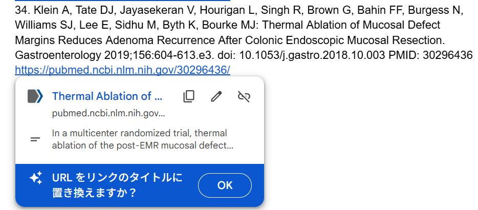*この際に、URLをリンクのタイトルに置き換えますか?のOKボタンをクリックすると、URL部分がその論文のタイトルに置き換わり、そこをクリックするとPubMedの該当文献のアブストラクトが開かれるようになる。今回はその必要はないので、そのままにしておく。