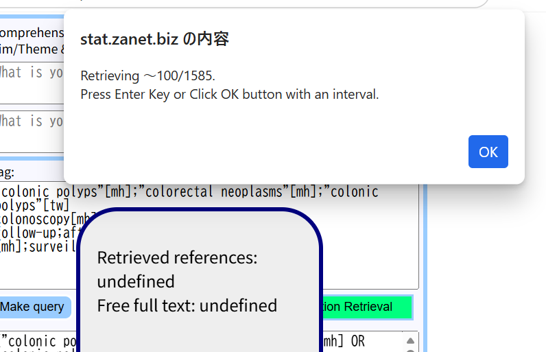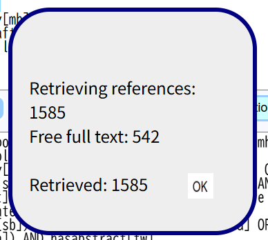 pmSearchのウインドウに戻り、引き出された文献数を確認しながら、OKボタンをクリックする。