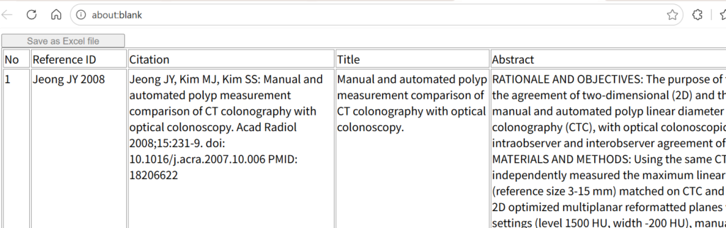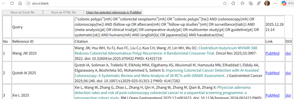 終了すると、下のフィールドに結果が書き込まれ、アブストラクトを含む文献一覧表が別のタブで表示される。