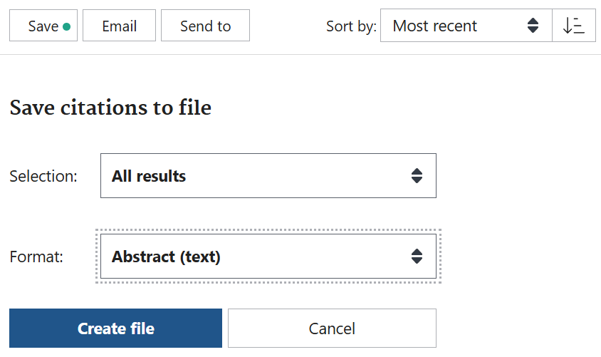 アブストラクトを含む文献一覧表の上にある、Save as Excel fileのボタンをShiftキーを押しながらクリックすると、結果をテキストファイルとして保存できる。保存したファイルを後で、400件ずつのテキストファイルに分割して、NLMのソースにアップロードするのに用いる。