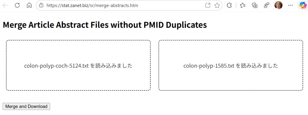 そのために、Merge Article Abstract Files without PMID Duplicatesというウェブツールを作成した。